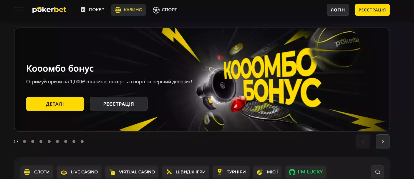 Особливо вам сподобається банер на головній сторінці – він динамічний і привертає увагу. Наприклад, рекламна акція “Кооомбо бонус” з привабливими візуальними ефектами одразу зацікавить вас можливістю отримати до 1000₴ на перший депозит. Ви обов’язково натиснете на “Деталі” або “Реєстрація”, щоб дізнатися більше та скористатися цією вигідною пропозицією.