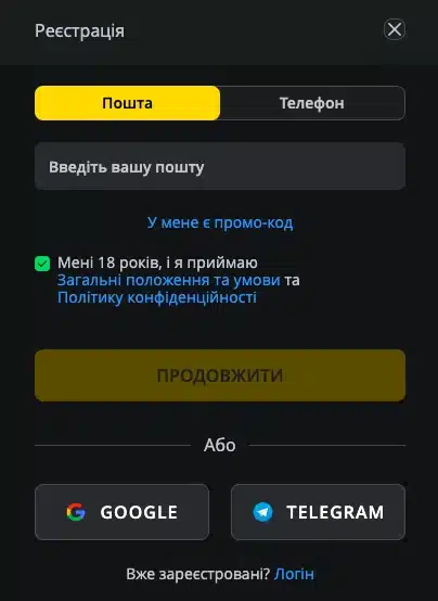 - Натисніть кнопку “Реєстрація” або “Створити акаунт”.