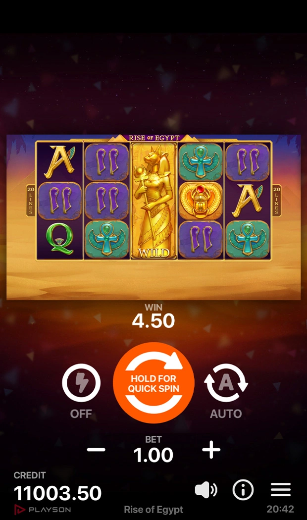 Rise of Egypt доступний у демо-режимі на офіційному сайті Playson та у більшості онлайн-казино, які співпрацюють з цим провайдером. Демо-версія надає гравцям віртуальні кредити для ознайомлення з грою без ризику втрати реальних коштів. Це ідеальний спосіб вивчити механіку гри, протестувати бонусні функції та визначити оптимальну стратегію ставок перед грою на реальні гроші.